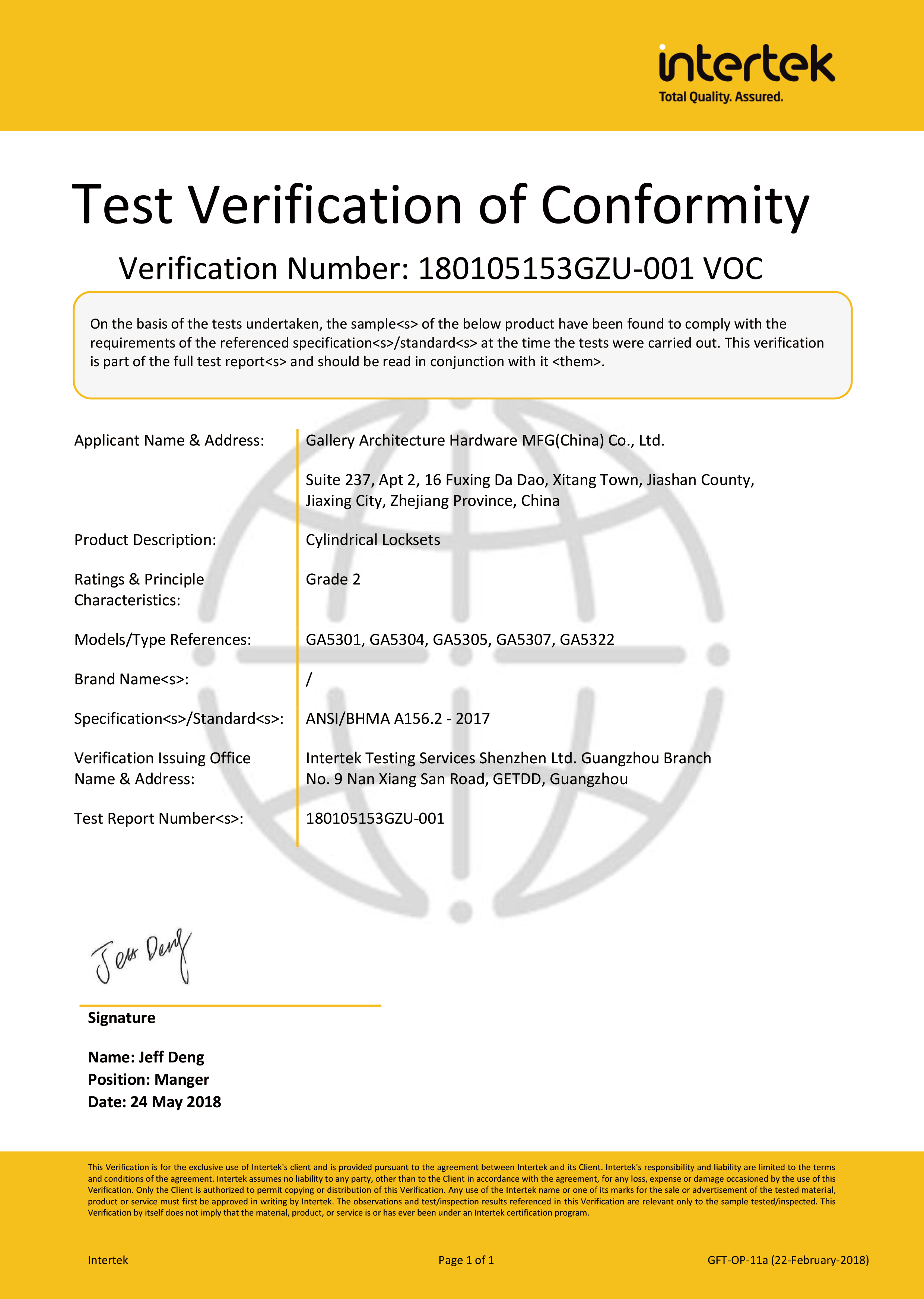 浙江堅迪五金制造有限公司始建于 1995 年。自 2003 開始,公司致力于高標準商業(yè)鎖的研發(fā)工作,并于 2006 及 2007 年,8700 插芯鎖系列獲得美國國家標準 ANSI A 156.13-2005 一級、ANSI A 156.2-2003 二級和美國 UL 10C3 小時防火測試認證。自 1998 年以來,公司不斷提升產(chǎn)品和客戶服務(wù)品質(zhì),并獲得了 ISO 9001 的認證。